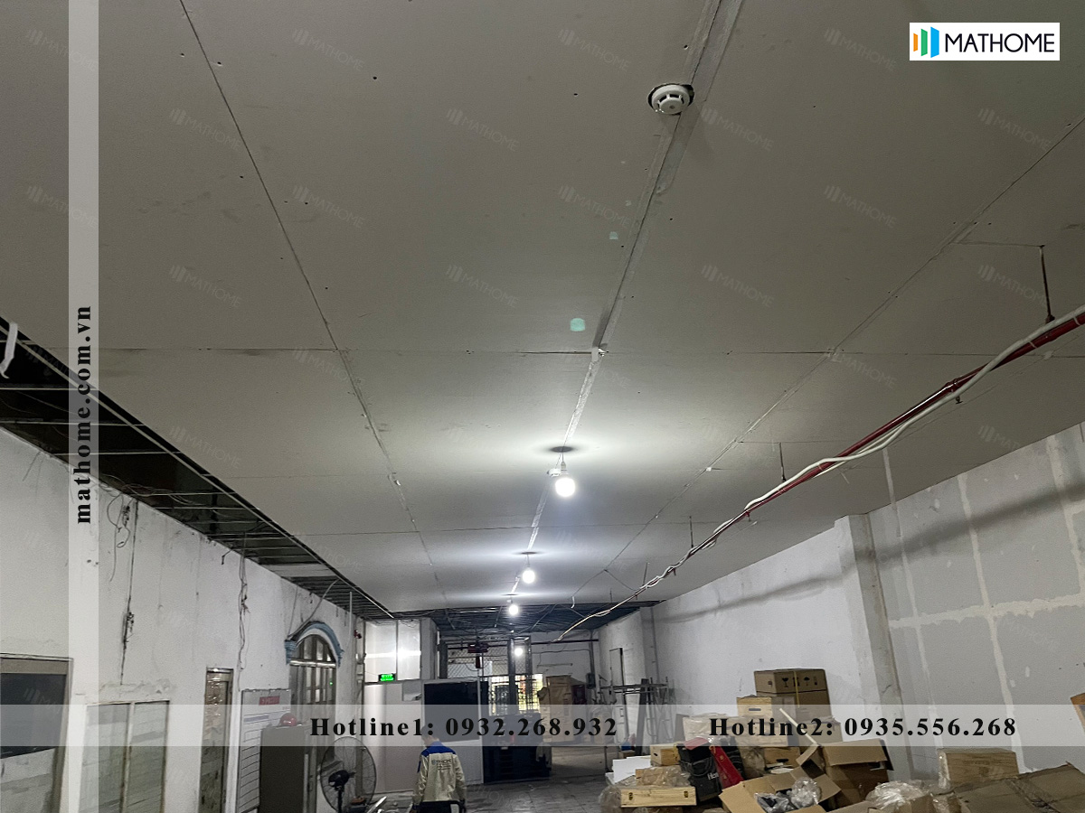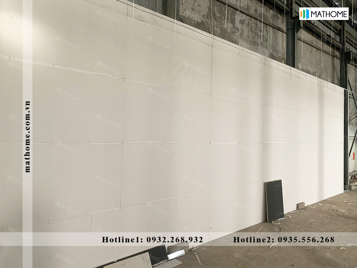 - Bước 4: Xử lý khe nối bằng bột bả + lưới để tạo bề mặt phẳng mịn.