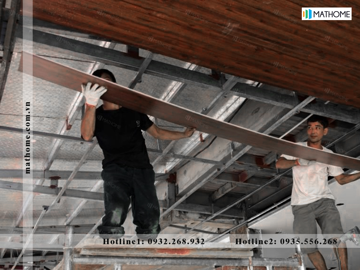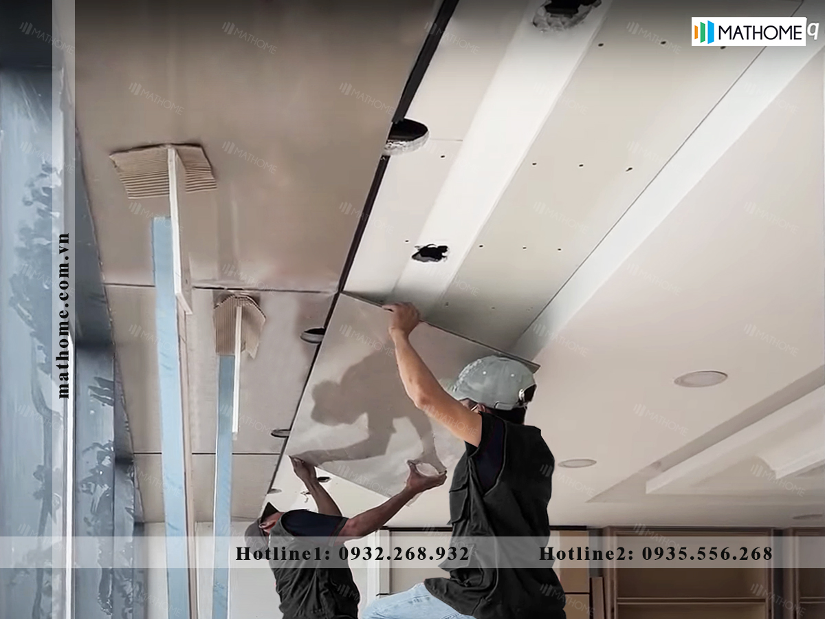 - Chuẩn bị tấm khổ lớn, nẹp, ty treo, khung xương, keo, vít, …