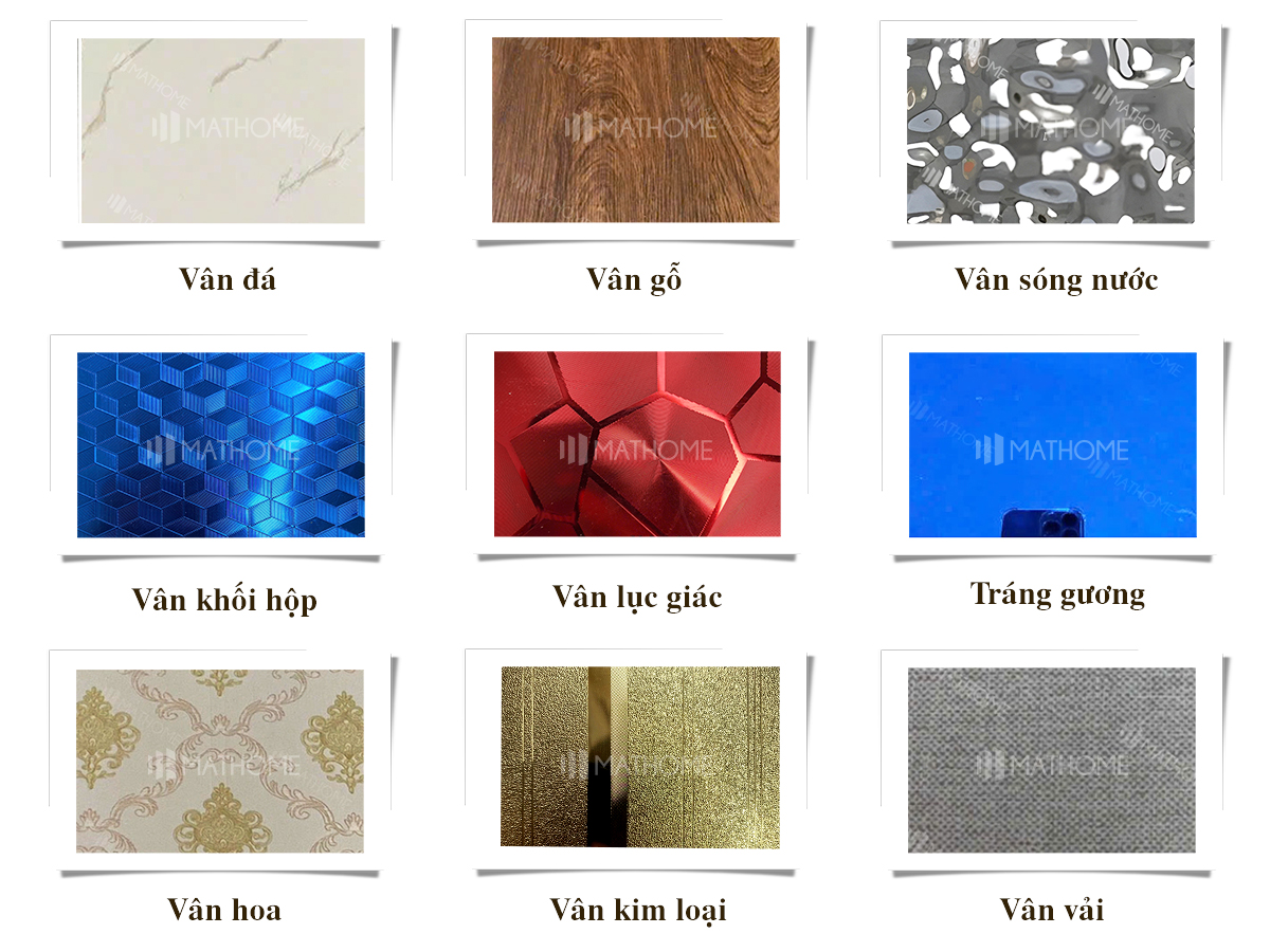 + Vân đá + Vân vải + Hoa + Đơn sắc (nhiều tương đồng với nhựa nano) |