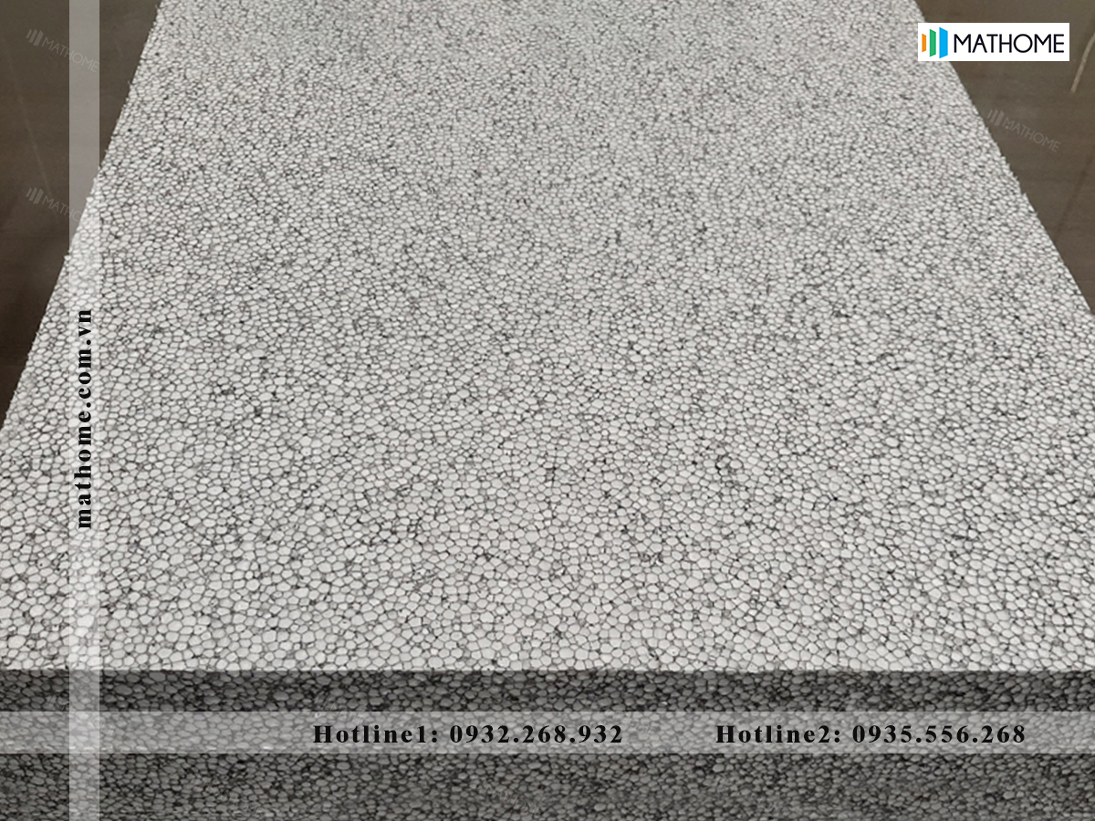 - Lớp lõi giữa: Là xốp EPS, được sản xuất từ nhựa Polystyrene nguyên sinh. Sau khi giãn nở, các hạt xốp chứa khoảng 98% không khí, giúp giảm trọng lượng và tạo khả năng cách nhiệt, cách âm vượt trội.