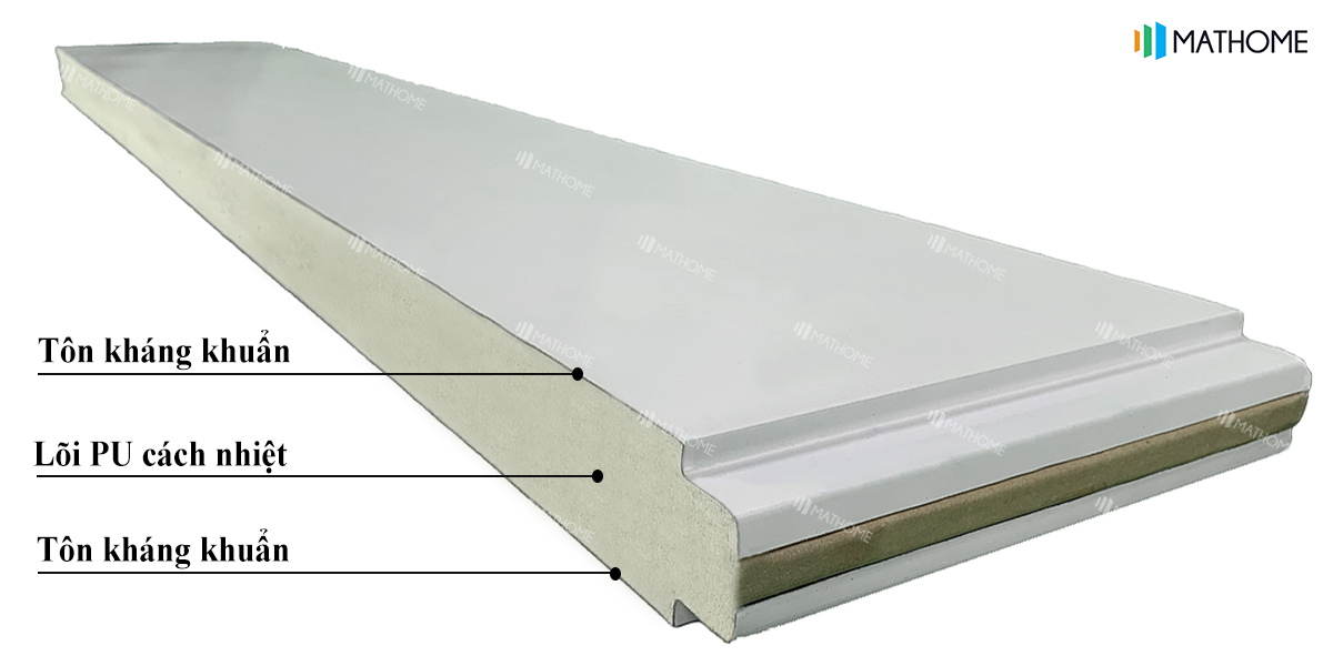 Về cơ bản, tấm Panel kháng khuẩn được cấu tạo theo dạng sandwich, gồm ba lớp chính sắp xếp theo trình tự tôn – xốp – tôn.