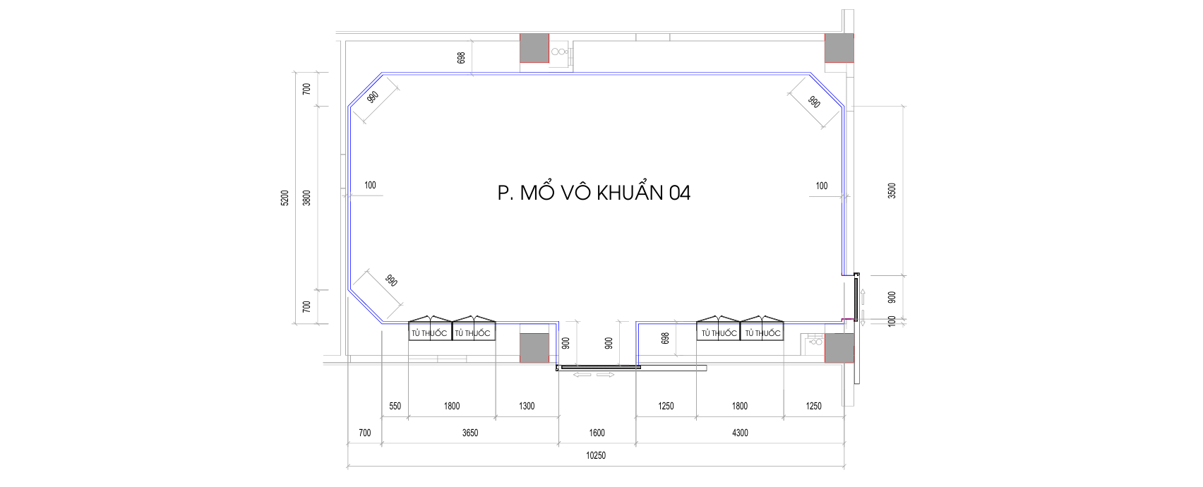 Bản vẽ thiết kế mặt bằng thể hiện phương án dựng vách và trần phòng mổ bằng Panel PU kháng khuẩn, bố trí theo tiêu chuẩn phòng sạch y tế, đảm bảo độ kín khí, cách nhiệt và vệ sinh vô trùng trong quá trình vận hành.