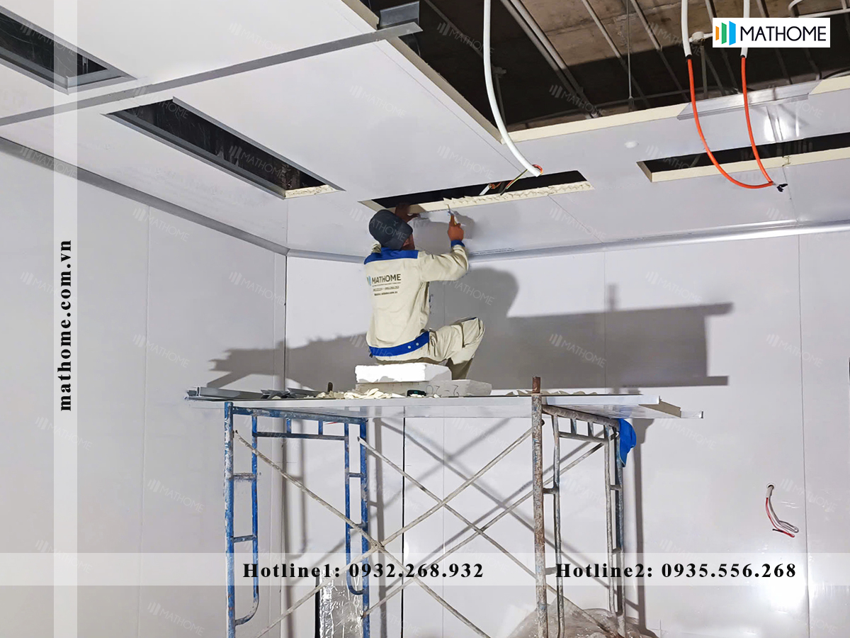 - Thi công vách và trần đồng thời. Trần có thể lắp đặt theo dạng treo hoặc gác lên khung xương.