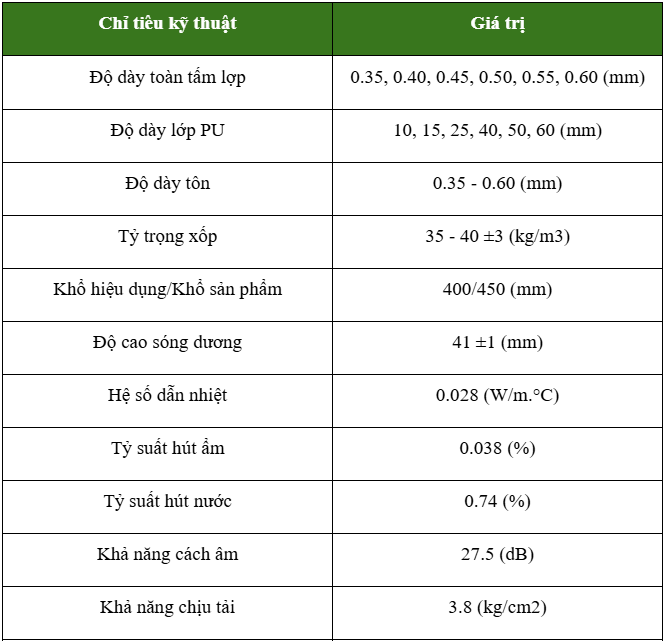 - Độ dày tấm lợp, độ dày tôn, độ dày lớp PU.
