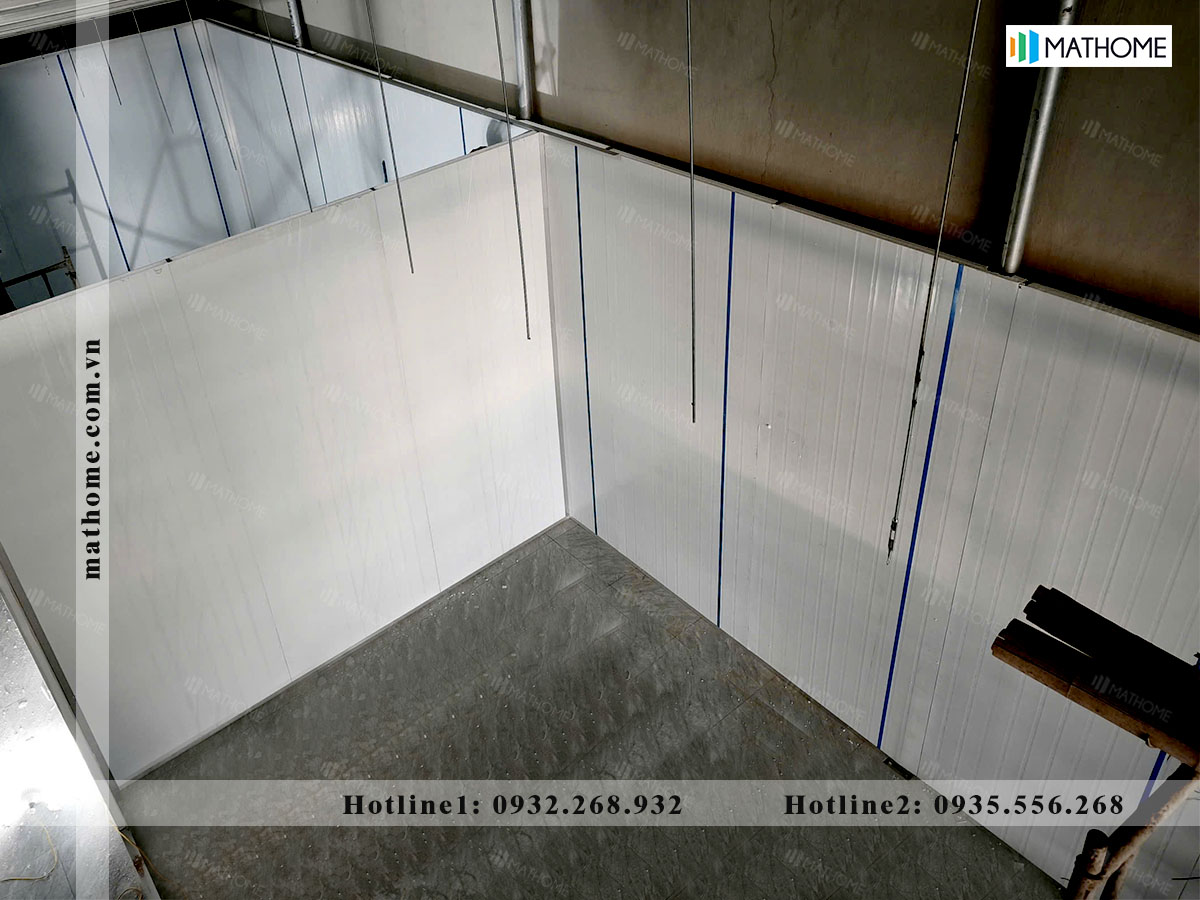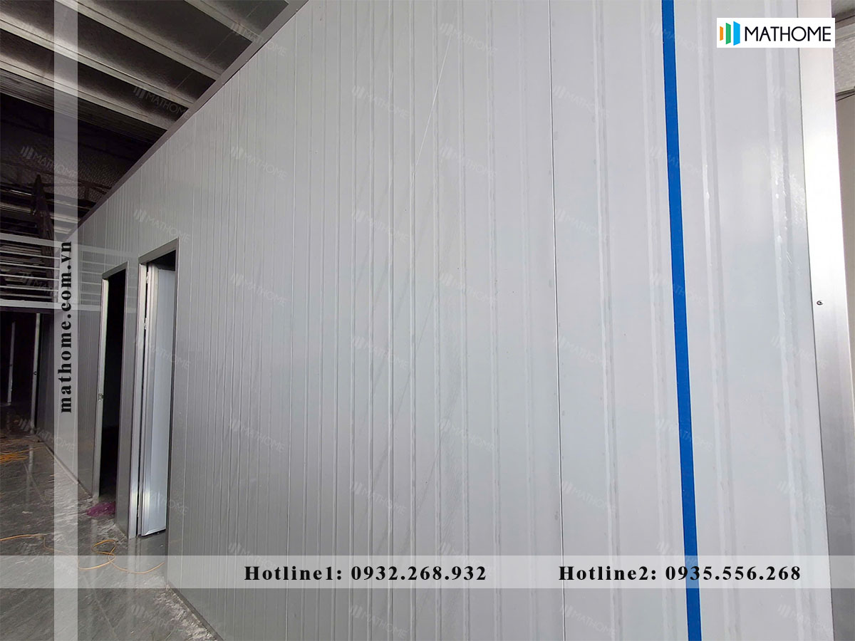 Hệ vách ngăn và vách bao sử dụng Panel EPS dày 50mm, chiều cao vách khoảng 3m. Độ dày này đáp ứng tốt nhu cầu che chắn, giảm nhiệt và tạo không gian ở ổn định cho nhân viên.