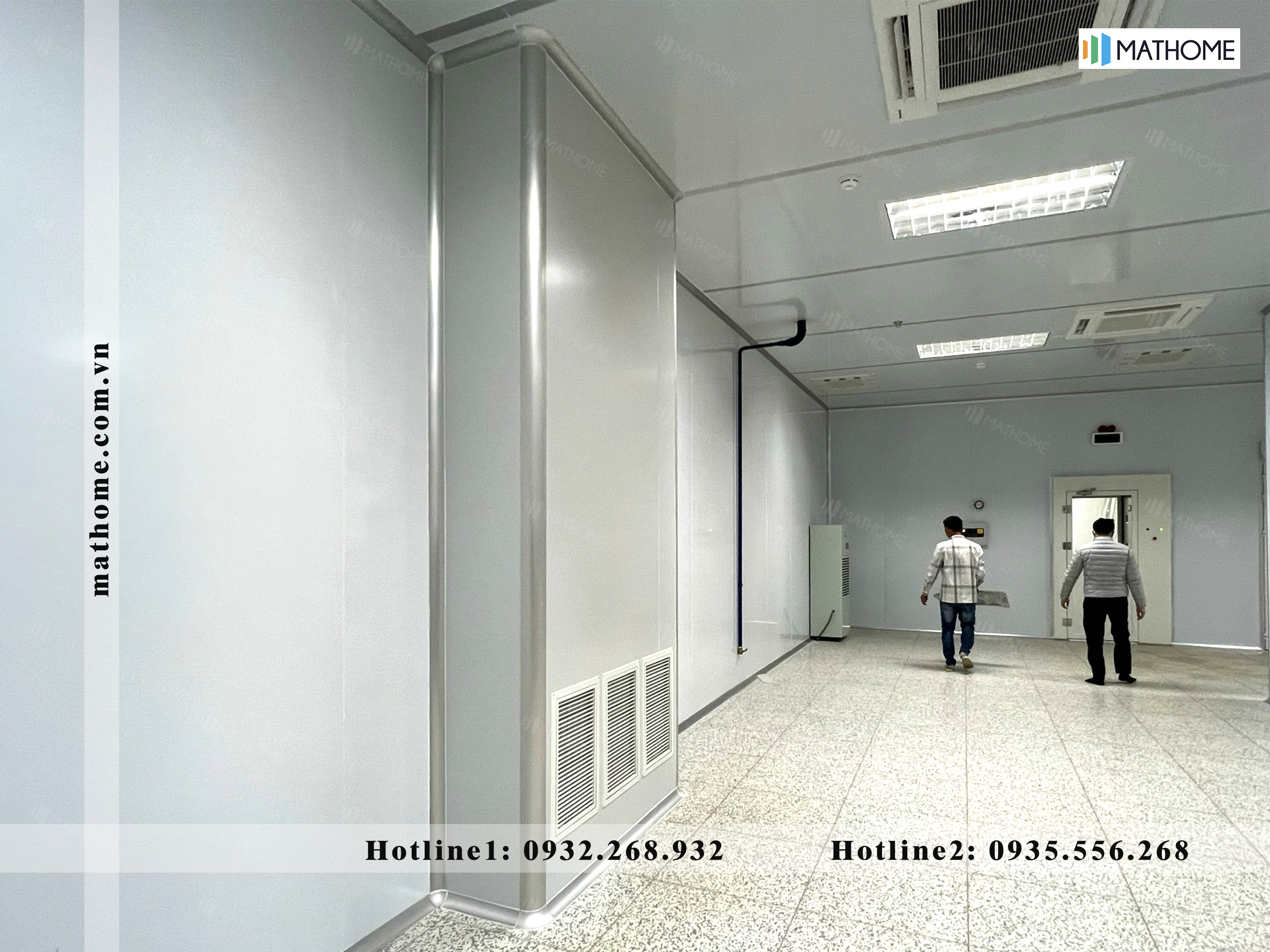 Đối với công trình tại Hòa Lạc, phòng sạch được ứng dụng trong sản xuất, lắp ráp bo mạch, chế tạo thiết bị điện tử chuyên dùng cho ngành cơ yếu như thiết bị mật mã, phần cứng bảo mật, hệ thống an toàn thông tin. Trong công trình lần này, Mathome Việt Nam đảm nhiệm vai trò đơn vị cung cấp vật tư và trực tiếp thi công vách, trần và bo cột cho phòng sạch.