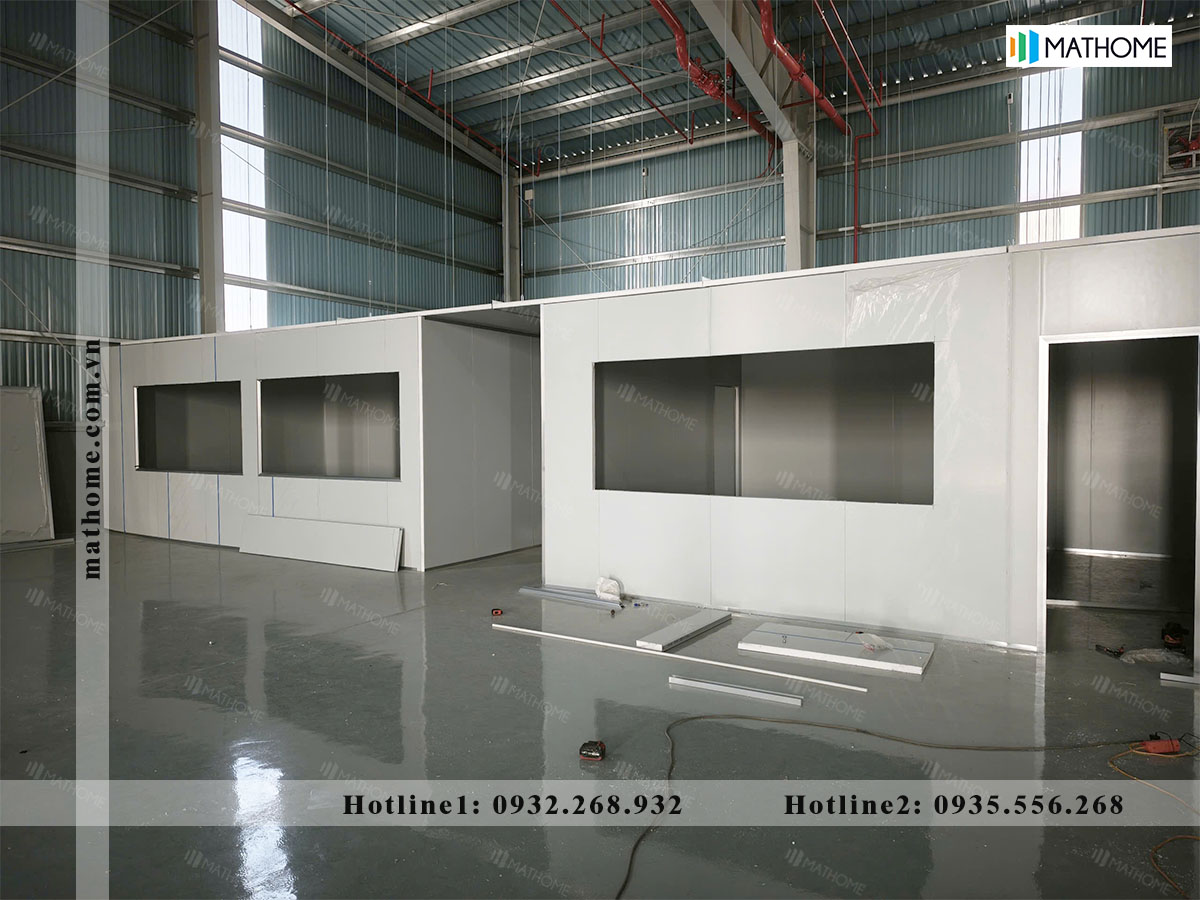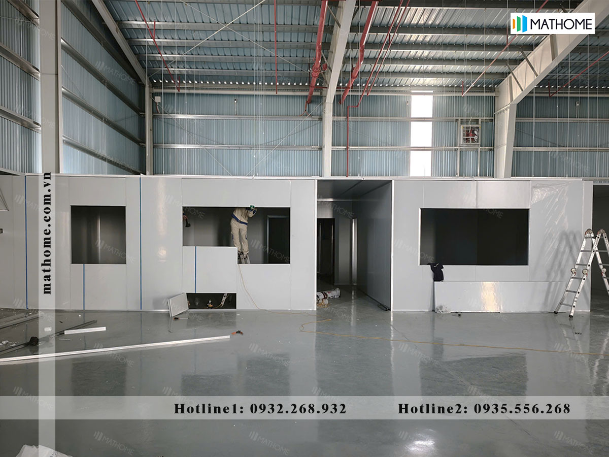 Toàn bộ khu văn phòng và nhà ăn được thi công bằng hệ Panel EPS 50mm nhằm đảm bảo tính đồng bộ và tối ưu tiến độ. Các hạng mục chính bao gồm vách ngăn, trần và cửa Panel.