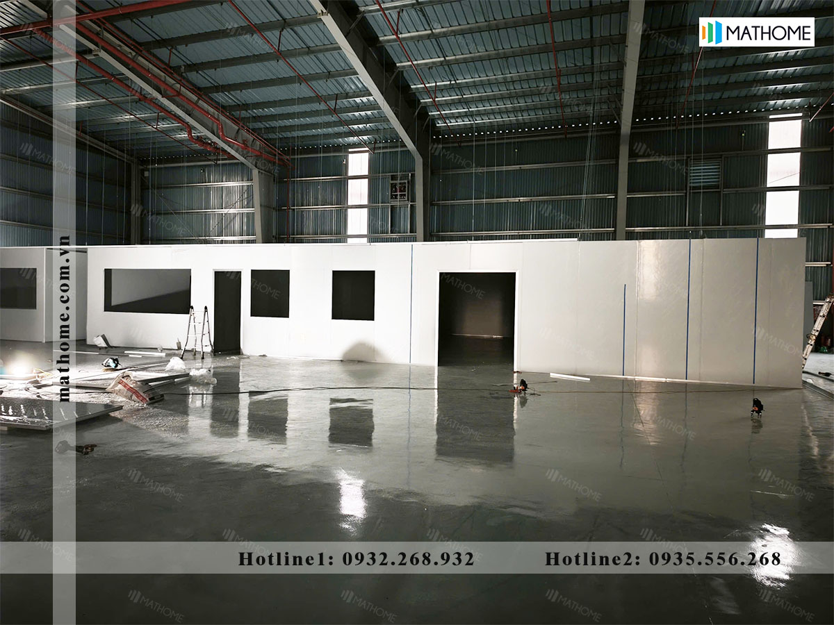 - Hệ vách Panel EPS: Sử dụng để ngăn chia các phòng chức năng. Vách có bề mặt phẳng, màu sắc đồng đều, phù hợp không gian làm việc trong nhà xưởng. Giải pháp này giúp thi công nhanh và dễ điều chỉnh khi cần thay đổi bố cục.