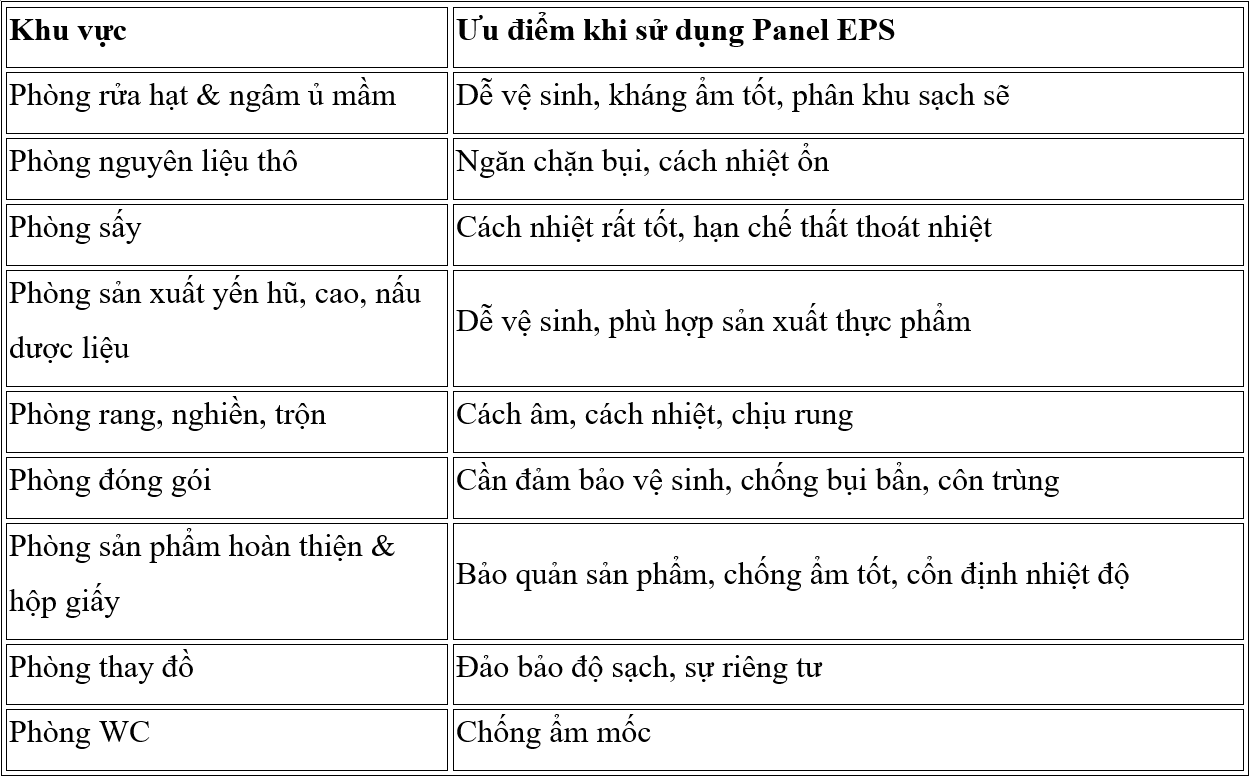 Bên cạnh đó, việc lựa chọn Panel EPS thi công vách, trần, cửa cho nhà xưởng sản xuất yến là sự lựa chọn phù hợp cho các hạng mục, yêu cầu của các phòng chức năng bên trong nhà xưởng: