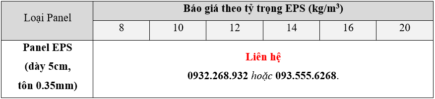 Mức giá tham khảo: Tại thời điểm hiện tại, Panel EPS 5cm – Tôn 3.5 zem loại vách trong có giá dao động khoảng 175.000 – 2xx.000 VNĐ/m², loại vách ngoài giá dao động từ 250.000 – 3xx.000 VNĐ/m² (tùy theo tỷ trọng xốp và chủng loại tôn).