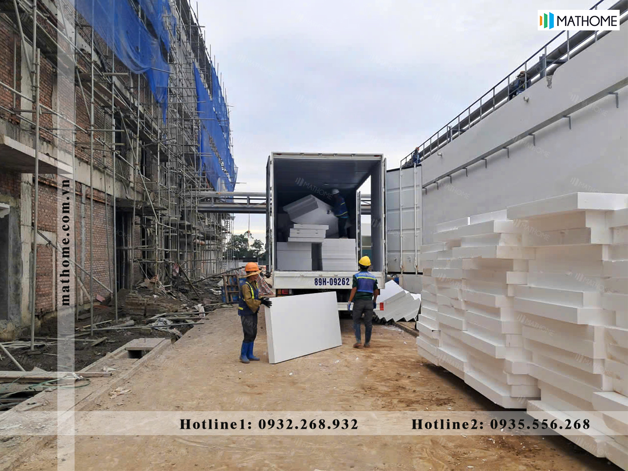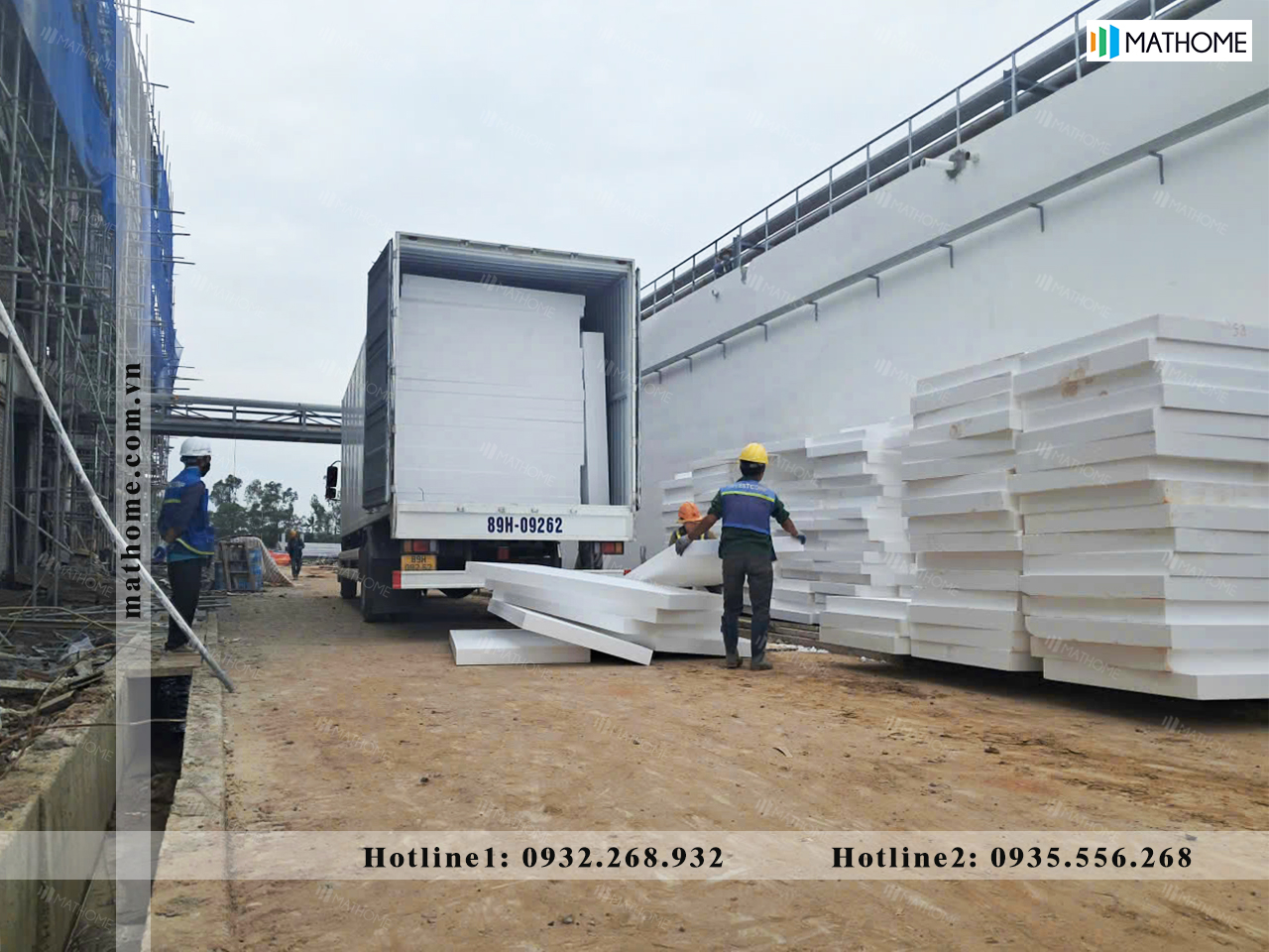 Hình ảnh ghi lại quá trình vận chuyển và bàn giao xốp EPS tỷ trọng 25kg/m3 phục vụ công tác tôn nền nhà máy tại KCN Bảo Minh, Ninh Bình. Toàn bộ khối lượng vật tư được Mathome cấp thành 2 đợt, đảm bảo đúng tiến độ thi công: